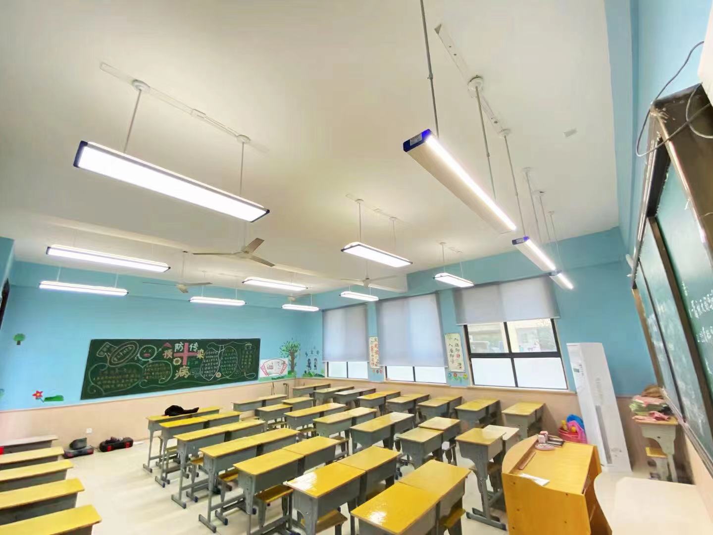 目前大部分的教室改造,采用的是“9+3”方案,即一個標(biāo)準(zhǔn)教室配備9個護(hù)眼教室燈加上3個專業(yè)黑板燈。在疫情之后,成才照明建議采用“9+3+2”模式:每個教室增加兩臺空氣殺菌機(jī),有效殺滅病菌,防止學(xué)生們密集交叉感染。