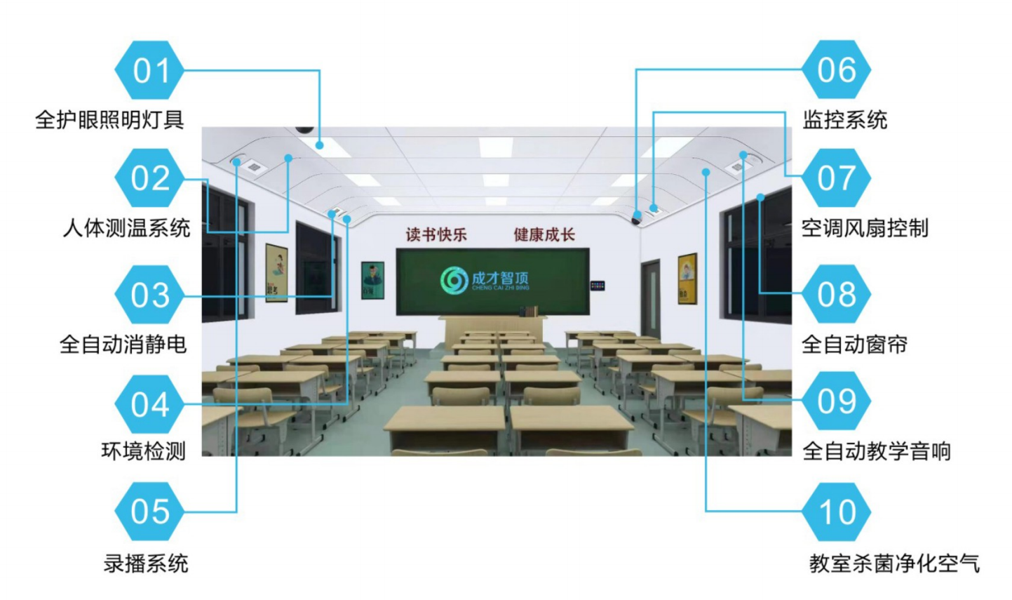 除此之外,成才智頂還實(shí)現(xiàn)了照明場景的?動切換,以及對照明、 消毒、監(jiān)控、窗簾、空調(diào)?扇、錄播、體溫監(jiān)測、靜電消除、環(huán)境監(jiān)測等進(jìn)?智能管理。